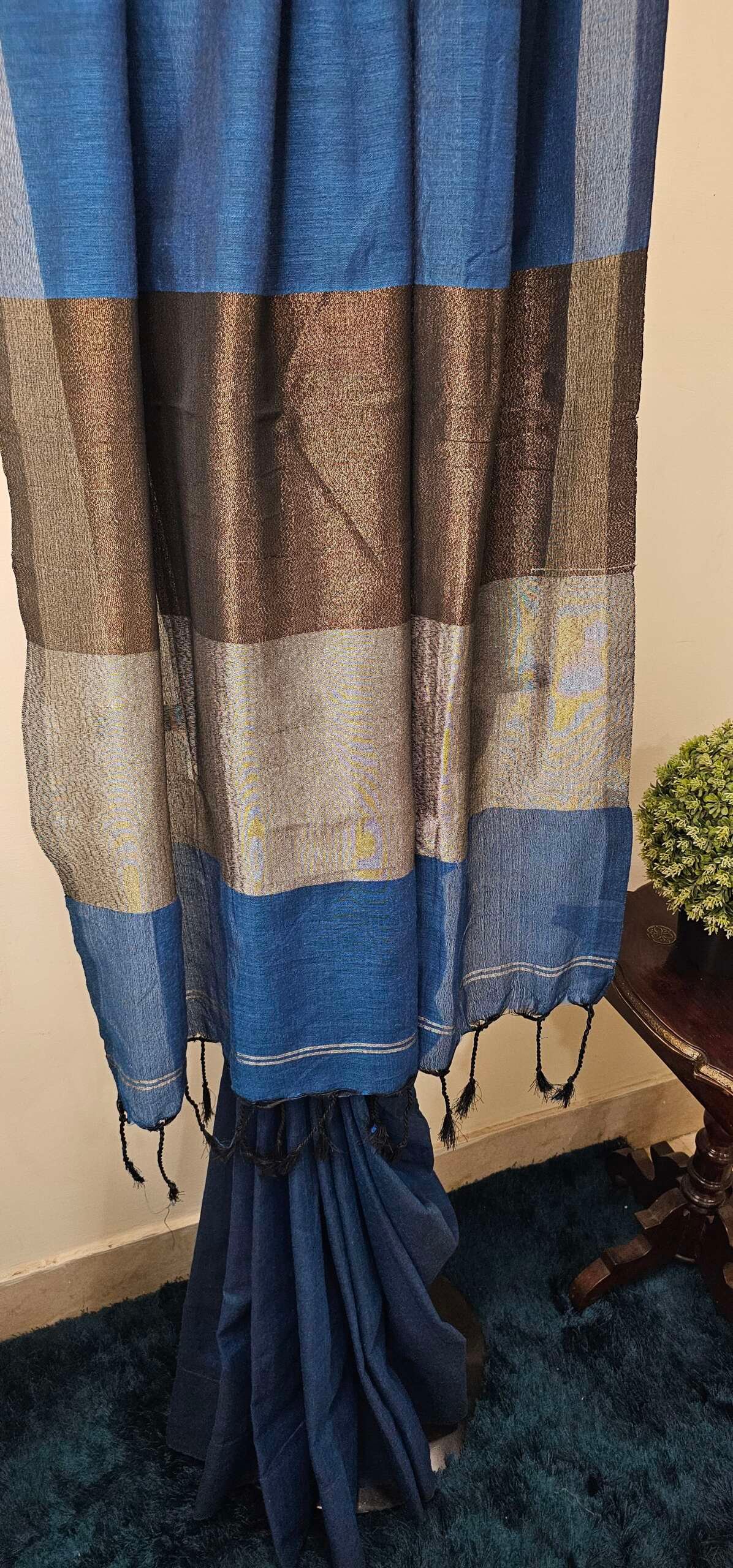 Stunning deep blue saree is a graceful blend of tradition and modern minimalism. Crafted in a soft, lightweight fabric, it drapes effortlessly and feels luxurious on the skin. The highlight of the saree lies in its rich pallu and borders, featuring broad stripes of silver and bronze zari that add a touch of festive shimmer and class.The subtle sheen of the zari contrasts beautifully with the matte blue base. Delicate black tassels at the edge of the pallu add a playful yet elegant detail.