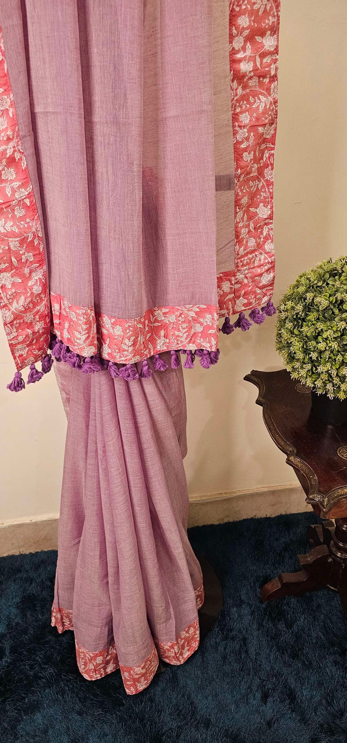 Lavender cotton saree blends simplicity with charm. The lightweight fabric ensures all-day comfort, while the soft lavender tone adds a calming elegance. It features a beautifully embroidered red border with delicate white floral patterns that bring a traditional touch to the modern look. Adding a fun and festive detail, the pallu is adorned with vibrant purple tassels that sway with every step.