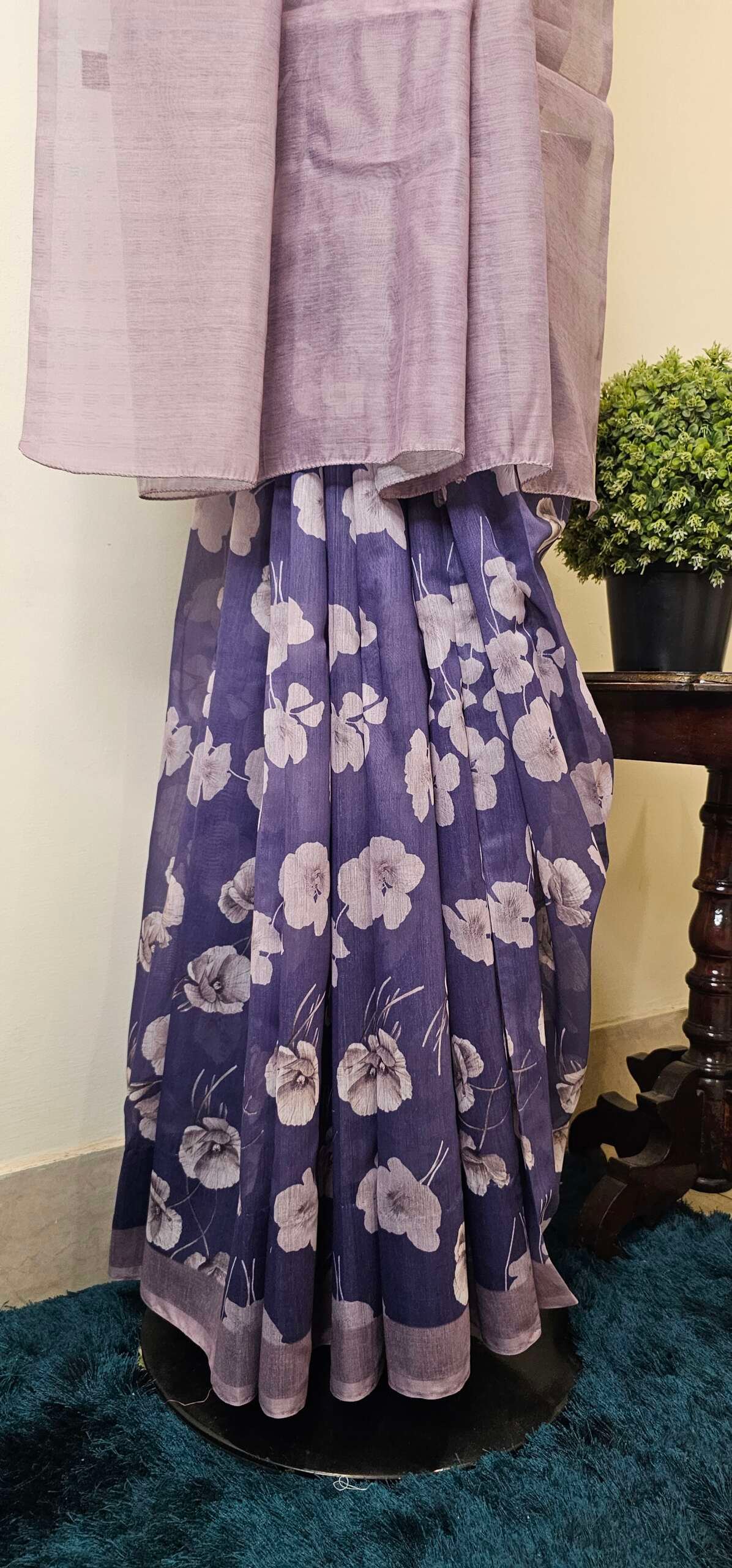 Beautiful lavender and navy blue saree, adorned with soft white floral prints. The saree features a contrast layout?the upper half in gentle lavender and the lower pleated part in rich navy blue, both highlighted with blooming white flowers that add a serene, fresh charm. Crafted from a lightweight, breathable fabric, this saree is ideal for hot weather. Its floral design keeps it lively, while the soothing color combination makes it calming and elegant. This saree brings together simplicity, beauty and grace effortlessly.