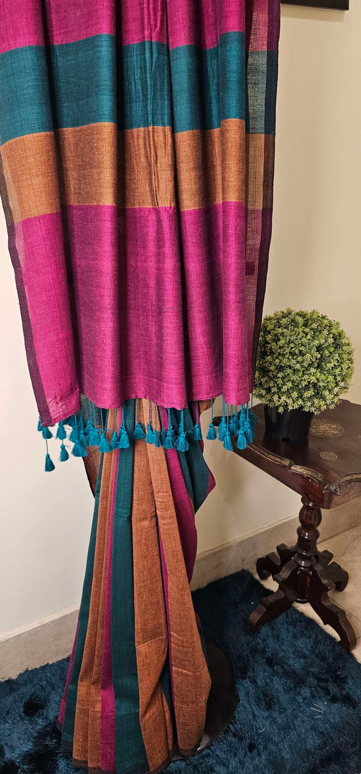 Vibrant striped saree in teal blue, deep magenta and warm mustard. The striking horizontal color blocks give this saree a bold, artistic look, while the fine handloom texture adds a touch of traditional charm. Finished with cheerful teal tassels along the pallu, this saree is all about effortless style and personality.This saree is perfect for women who enjoy wearing colors that speak volumes without saying a word.