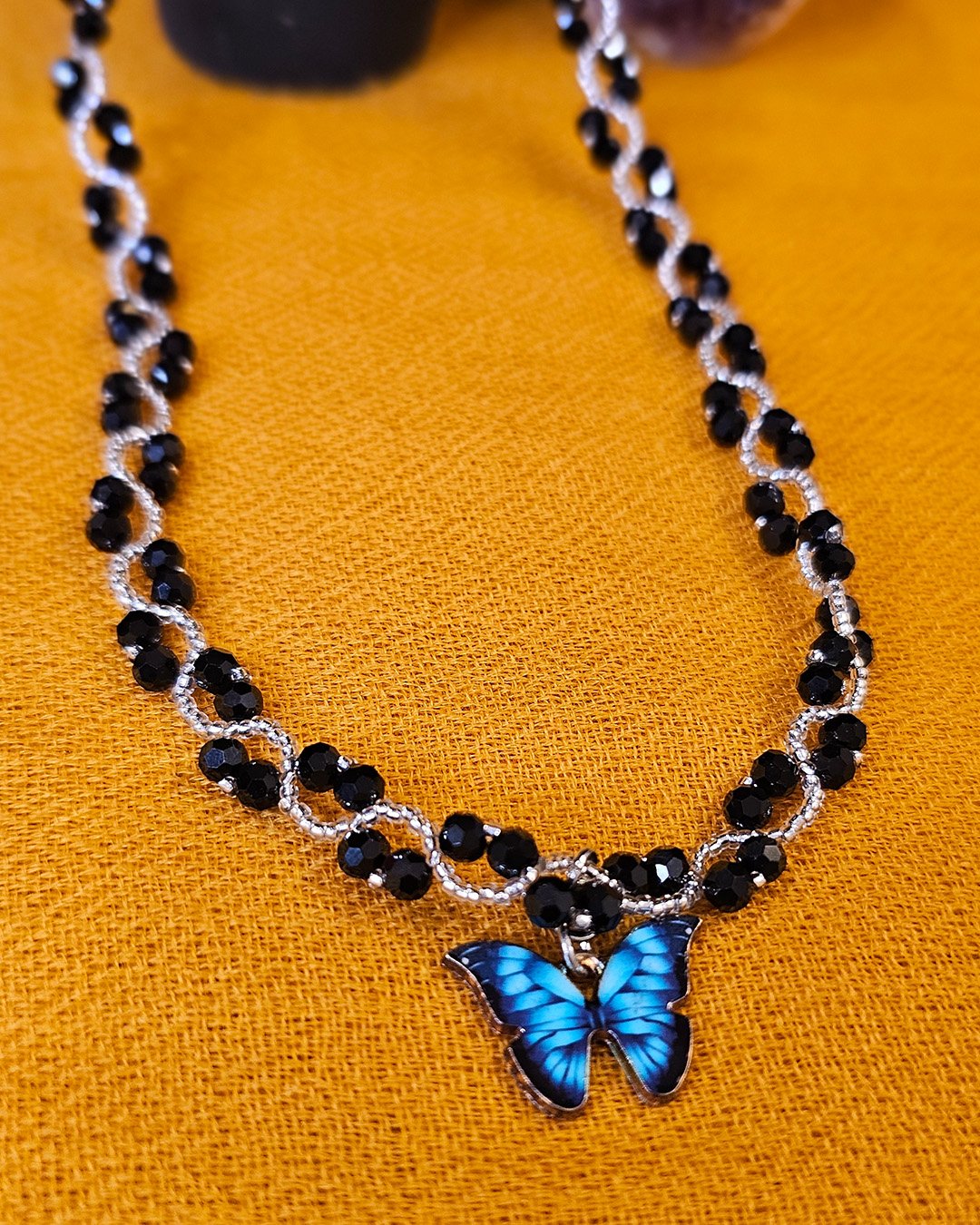 Butterfly Peas’ – a stunning black beaded necklace with a radiant blue butterfly pendant, symbolizing elegance and transformation