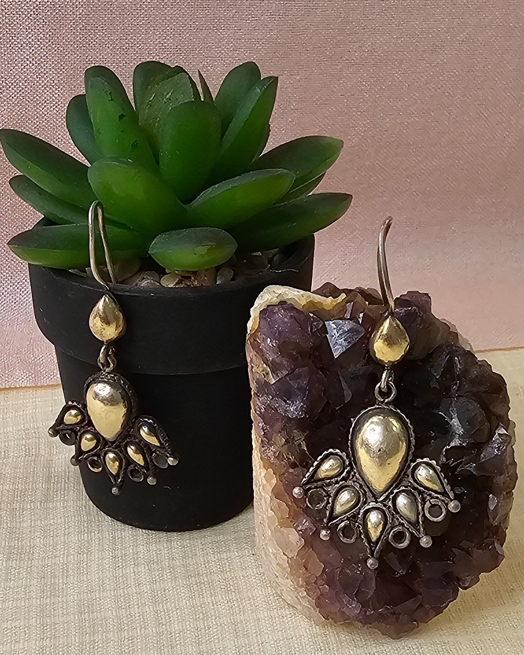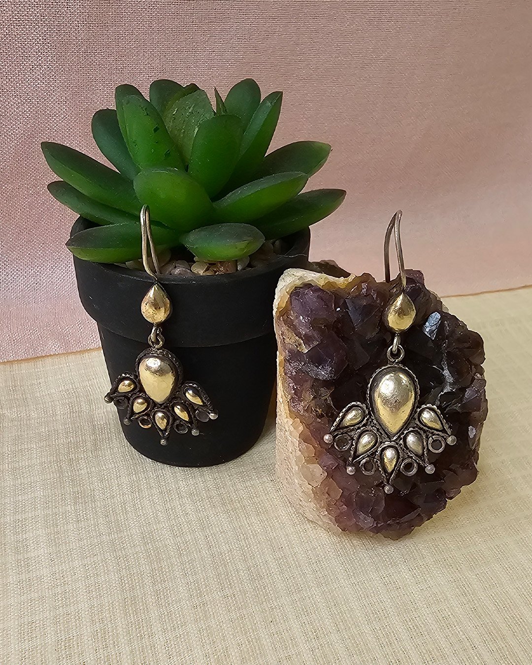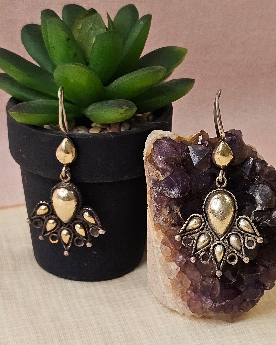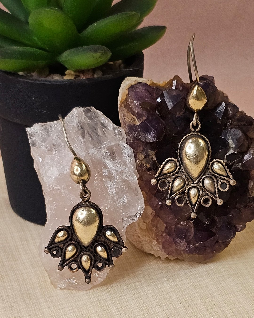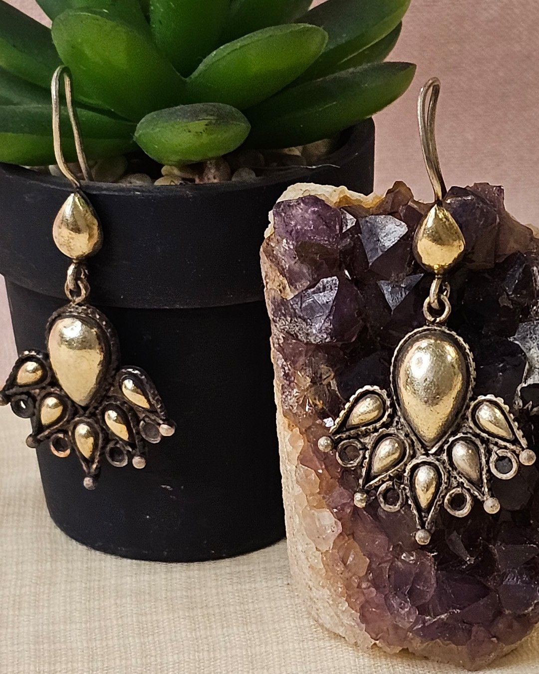 Beautifully crafted in an antique gold-tone finish, featuring an intricate, vintage-inspired design. The main element is a teardrop-shaped gold centerpiece, surrounded by smaller gold teardrops, giving the earrings a regal and bohemian charm. The oxidized detailing enhances the depth and character of the piece, making it stand out. The earrings dangle gracefully from a gold-tone hook, adding elegance and movement. Perfect for adding a touch of old-world charm to any outfit