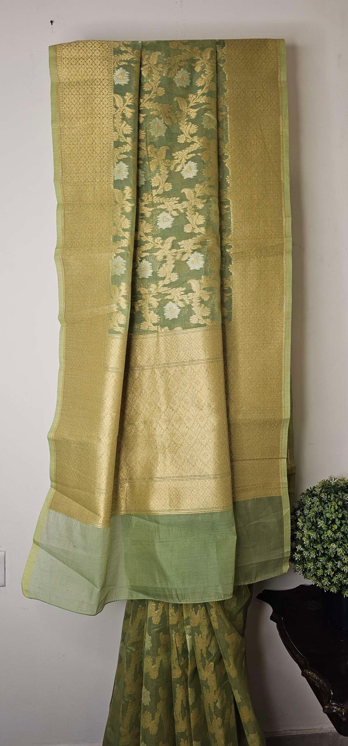 Stunning olive green Banarasi saree, beautifully woven with intricate golden zari work. The saree features a luxurious pallu with detailed floral motifs and textured patterns that reflect rich craftsmanship. The soft green body is adorned with traditional golden weaving, offering a royal yet soothing look.