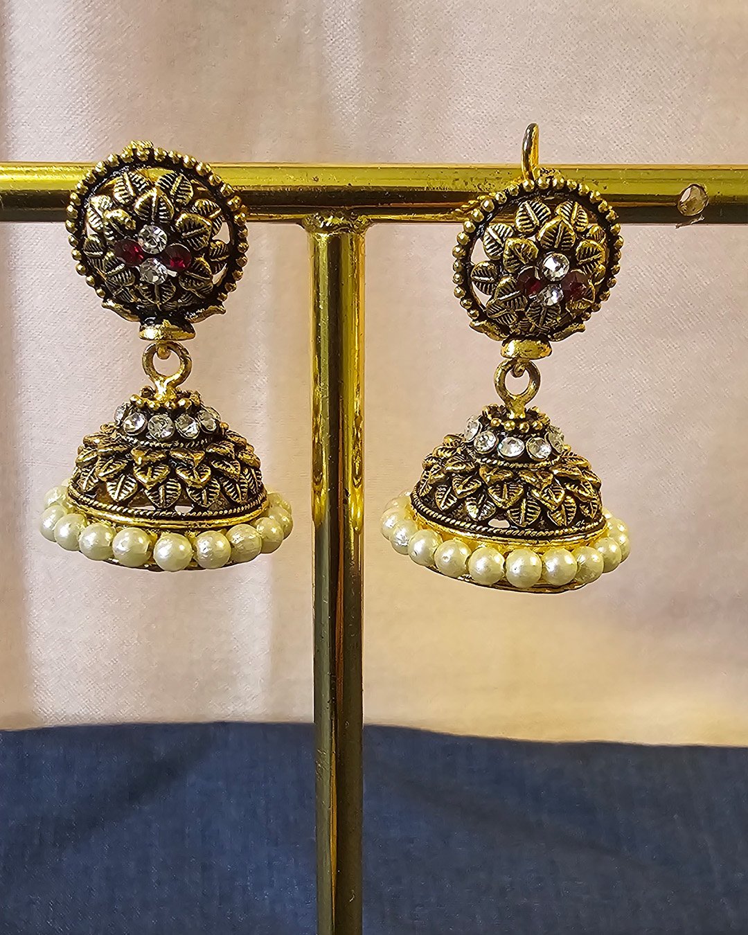 Exquisite antique gold-tone jhumka earrings are a tribute to heritage craftsmanship. The circular floral stud, adorned with tiny red and white stones, leads gracefully into a dome-shaped bell that is intricately carved with delicate leaf motifs. The dome sparkles with white stones and is bordered with a dainty string of ivory pearls, adding a touch of regal elegance. Perfect for festive occasions or ethnic ensembles, these earrings beautifully blend vintage charm with ornate detail, making them a statement of cultural pride and artisanal finesse.