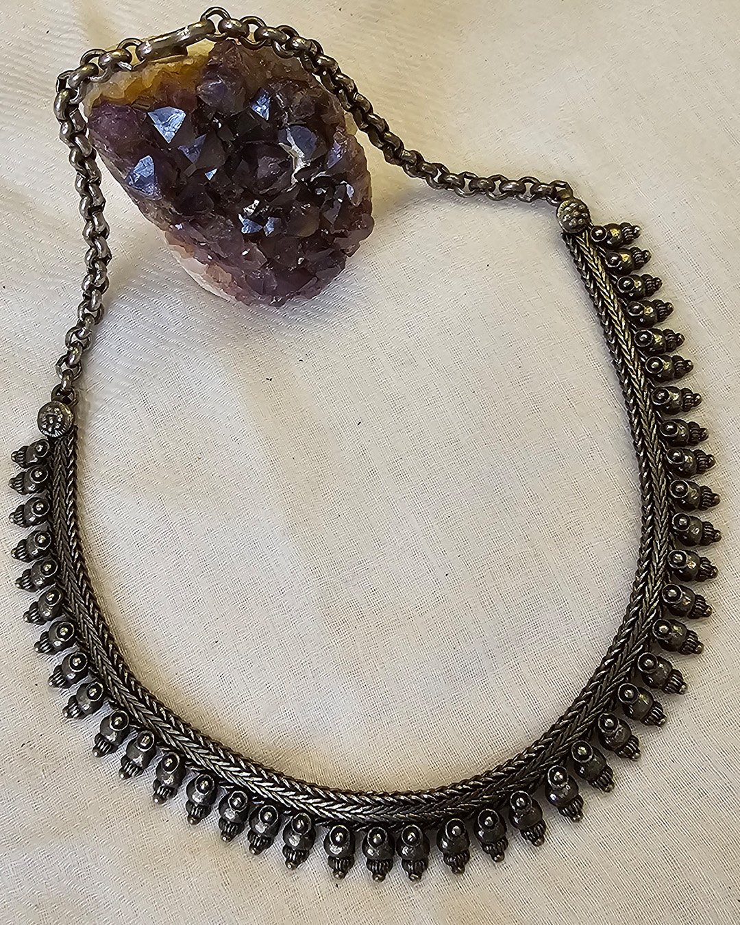 Antique silver-tone necklace brings the essence of old-world charm to life. The piece features a sturdy woven chain base adorned with a symmetrical row of tiny, temple-inspired motifs?each resembling a miniature bell or lamp, meticulously detailed with fine granules and beaded edges. The oxidized finish gives it a vintage patina, enhancing its rustic beauty and cultural depth.