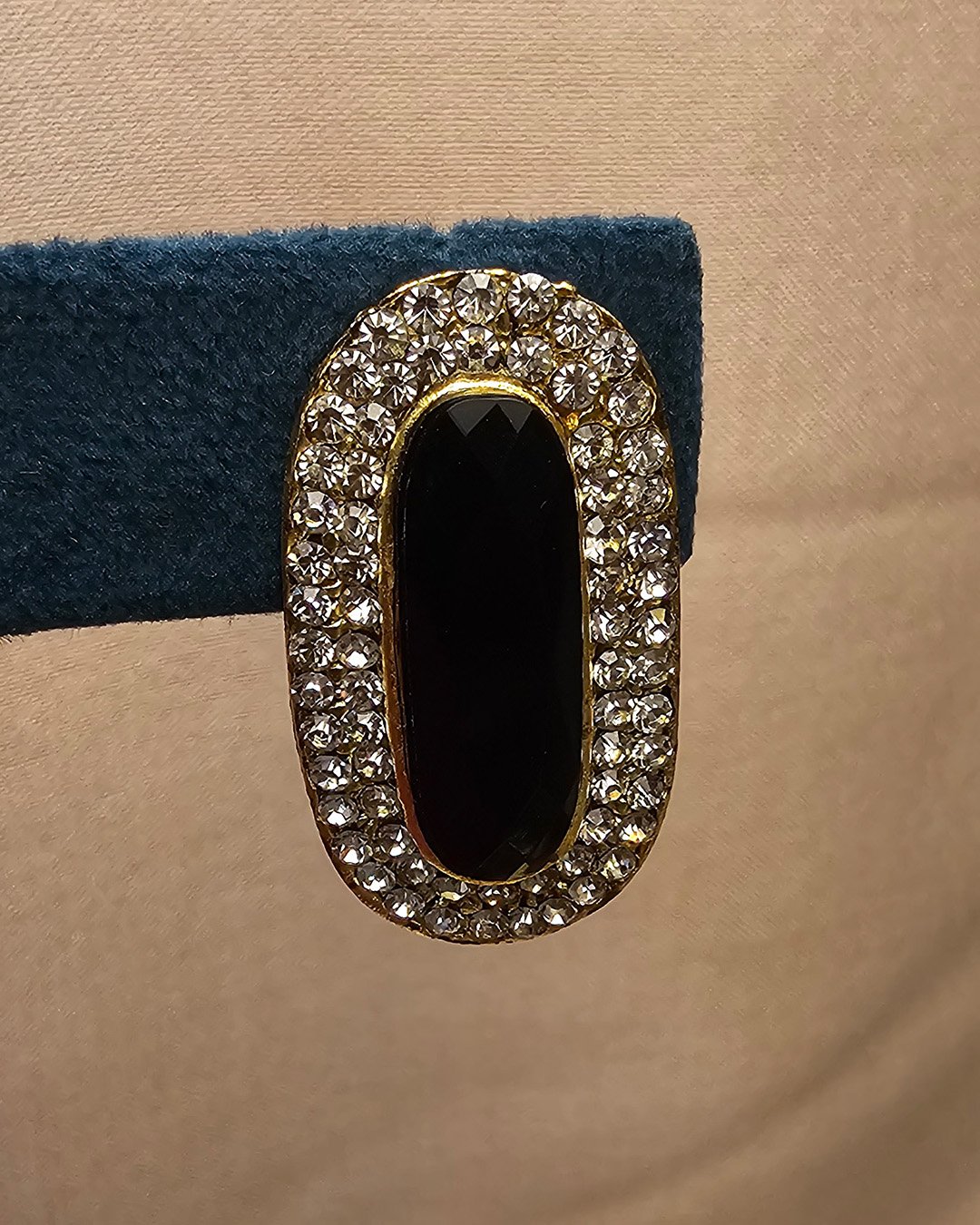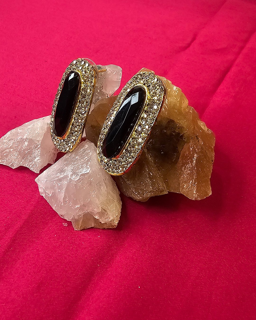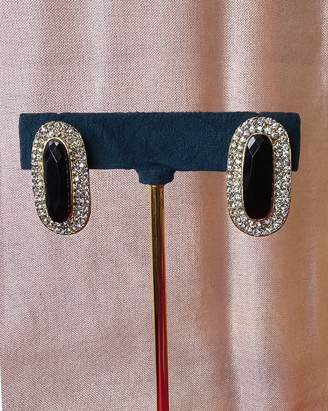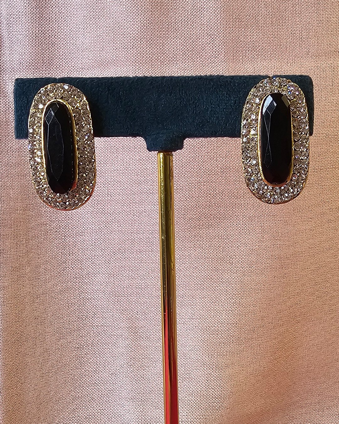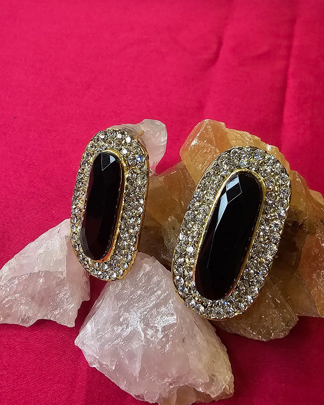 Elegant earrings feature a striking black gemstone at the center, faceted for a refined look. Surrounding the stone is a shimmering halo of small, clear crystals, set in a gold-tone metal frame that enhances the luxurious appeal. The elongated oval design adds a sophisticated touch, making them perfect for both formal and glamorous occasions.