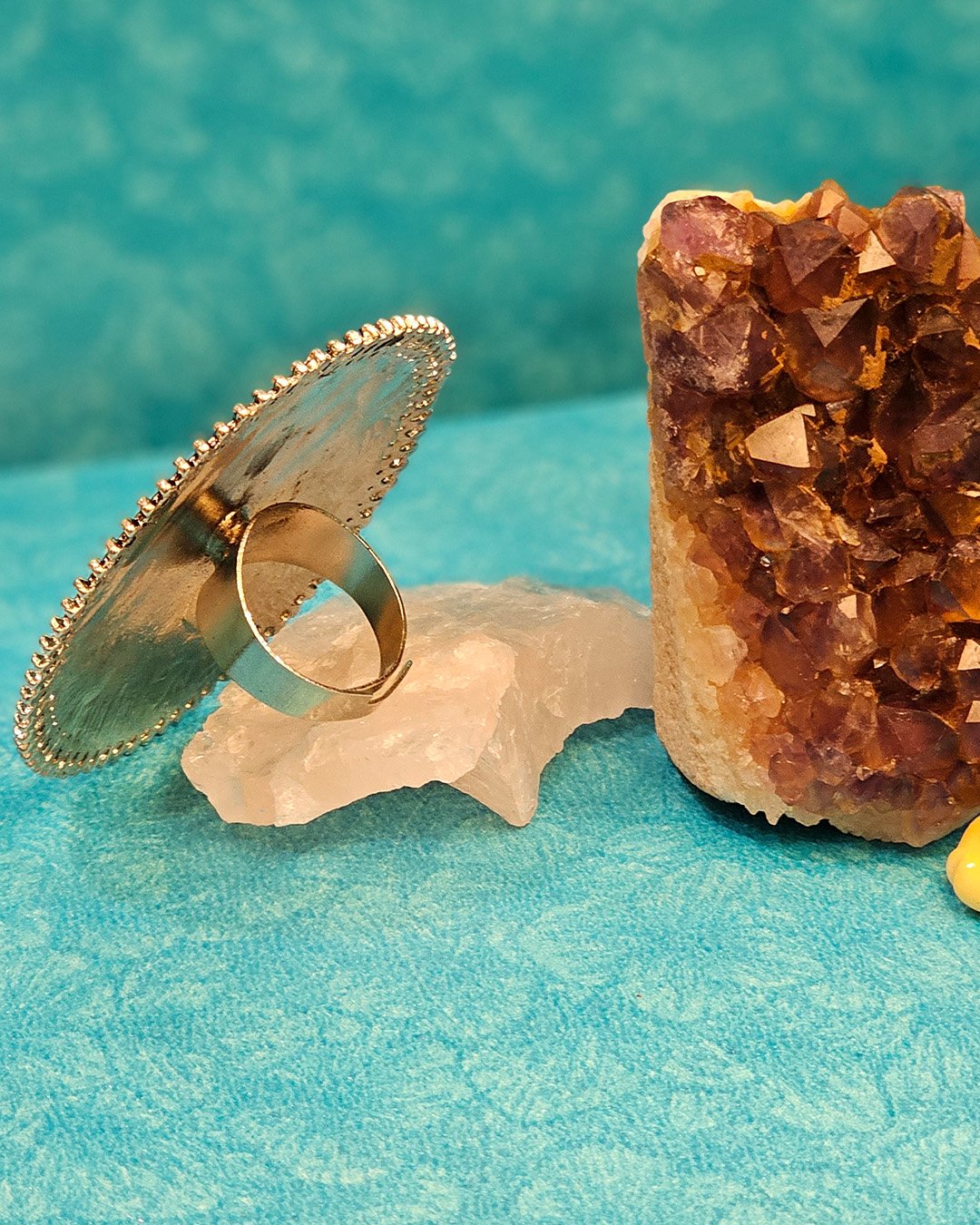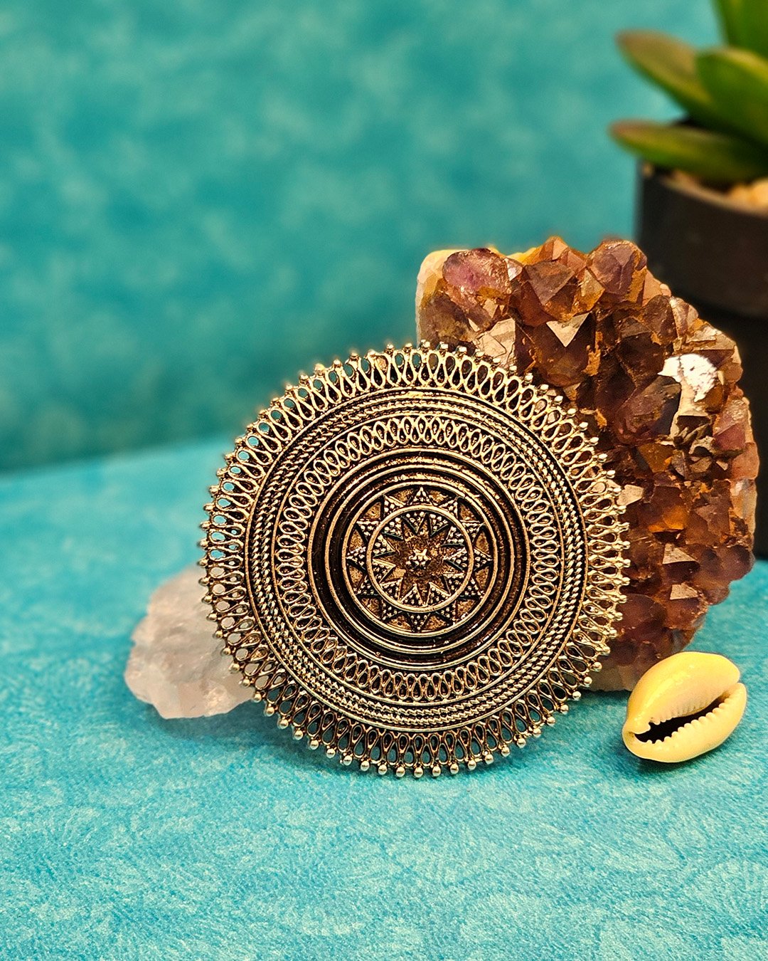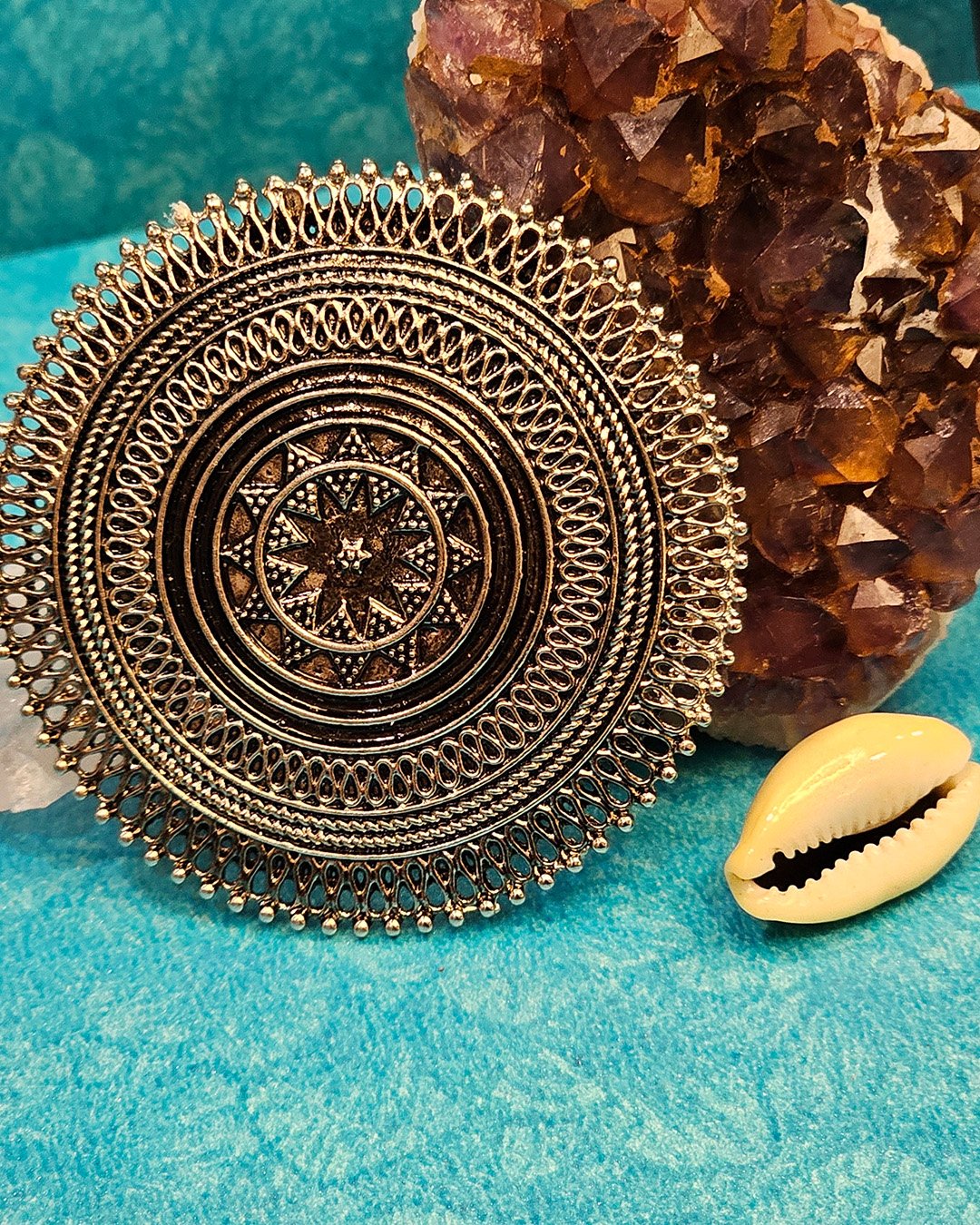 Exquisite ring features a stunning, antique-inspired circular design with intricate detailing that exudes timeless elegance. The elaborate patterns, reminiscent of traditional filigree work, radiate from a central starburst motif, adding depth and artistry to the piece. Encased within multiple concentric layers of ornamental loops and textures, the ring showcases impeccable craftsmanship, making it a true statement accessory. The oxidized metal finish enhances its vintage appeal, making it a perfect addition to ethnic and bohemian-inspired ensembles.