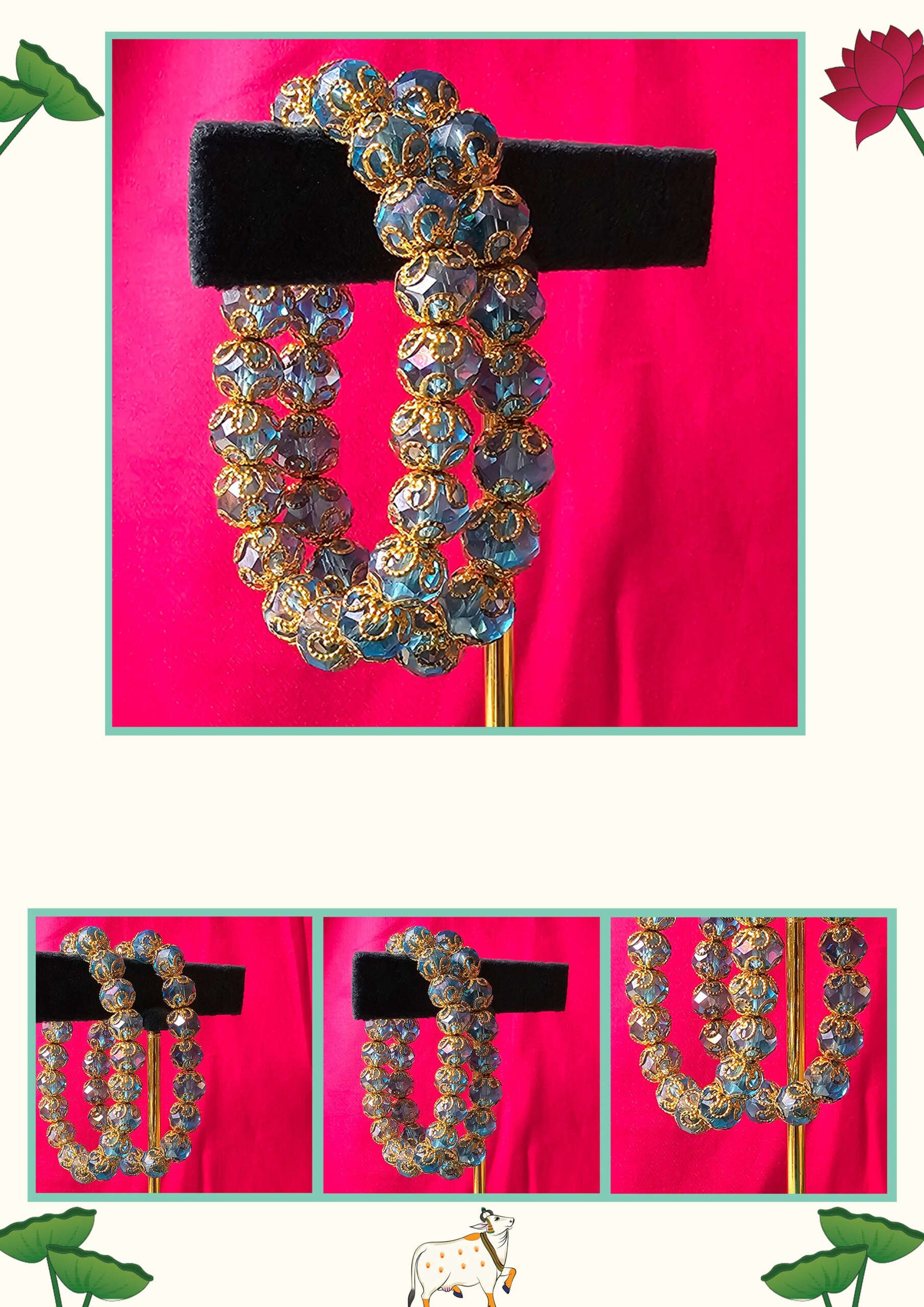 Stunning beaded bracelet, showcasing vibrant blue crystal beads. Each bead is encased in detailed golden filigree caps, giving the piece a regal and luxurious appearance. The crystals reflect light beautifully, creating a dazzling sparkle that’s perfect for festive occasions, parties or traditional outfits. Whether worn alone or stacked, it brings a graceful charm that effortlessly elevates your style.