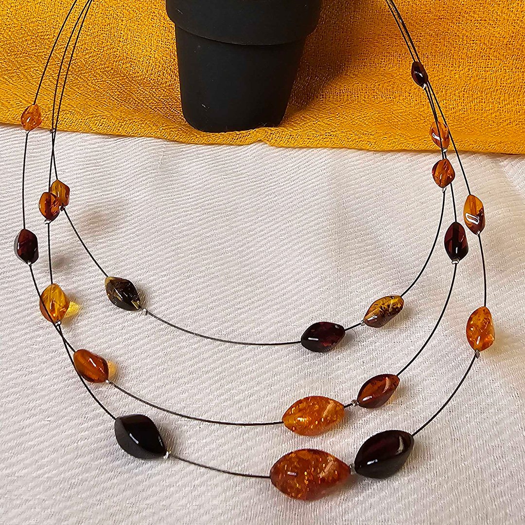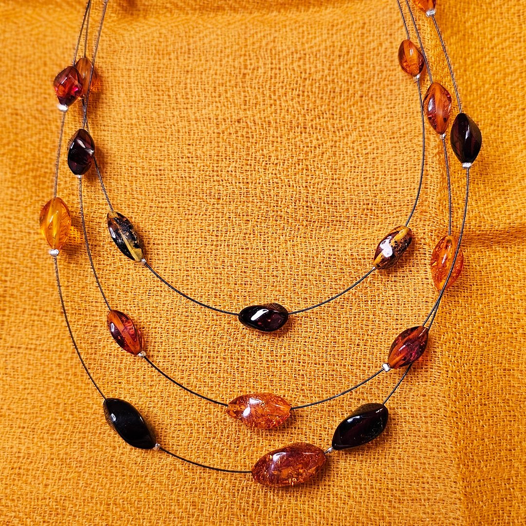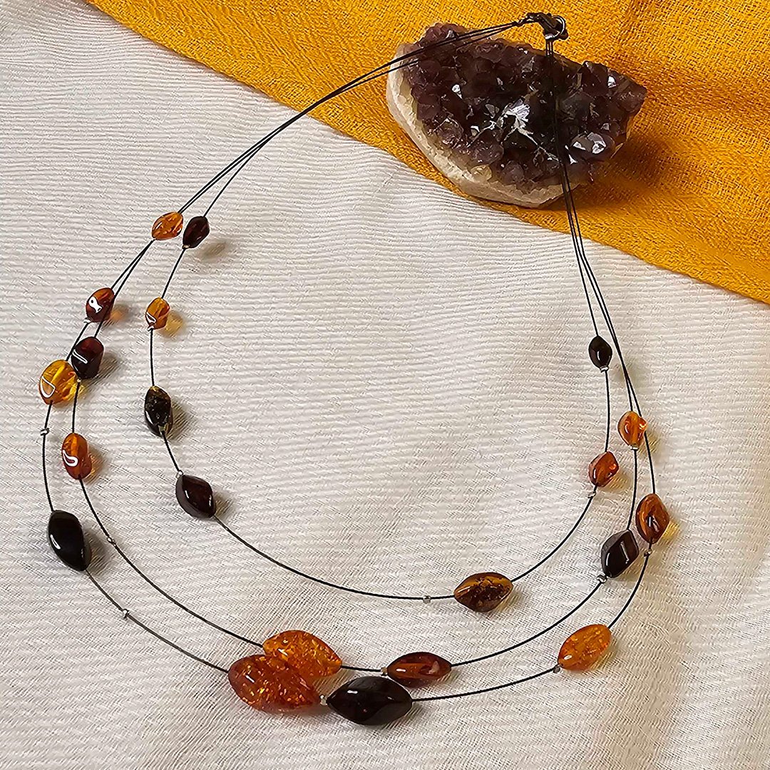 Multi-strand necklace features polished amber stones in warm honey, cognac and deep brown hues, delicately suspended on fine black wires. The minimalist floating design highlights the natural beauty of each unique amber bead, creating a lightweight and sophisticated look. Perfect for those who appreciate understated elegance, this necklace adds a touch of organic charm to both casual and formal outfits.