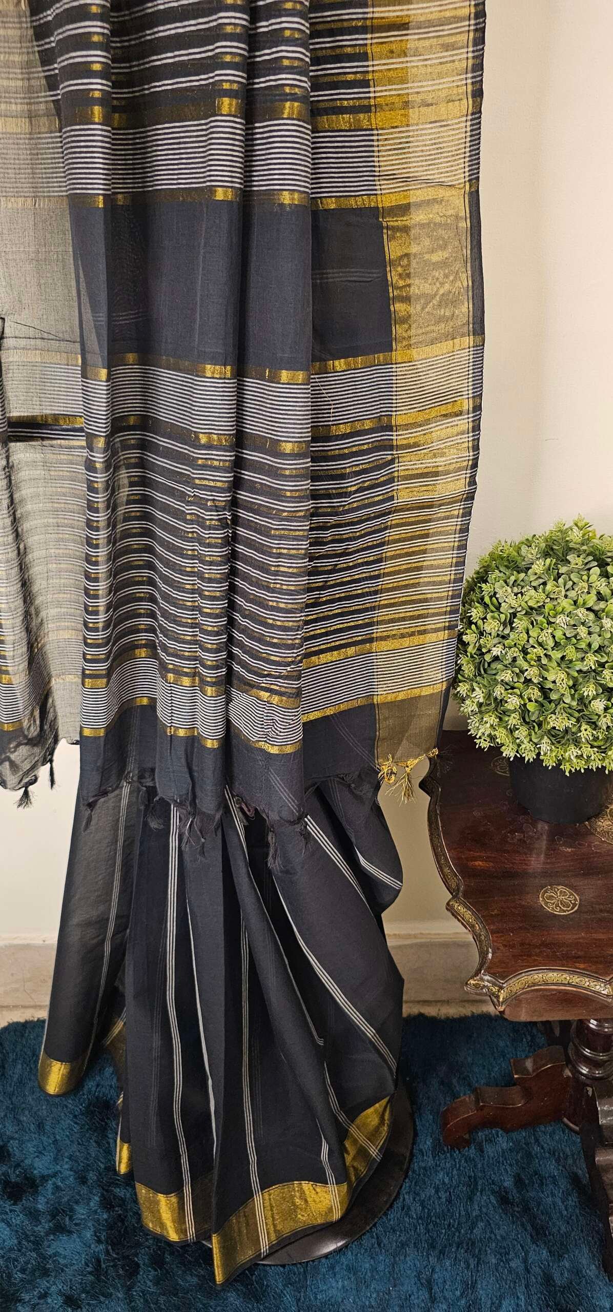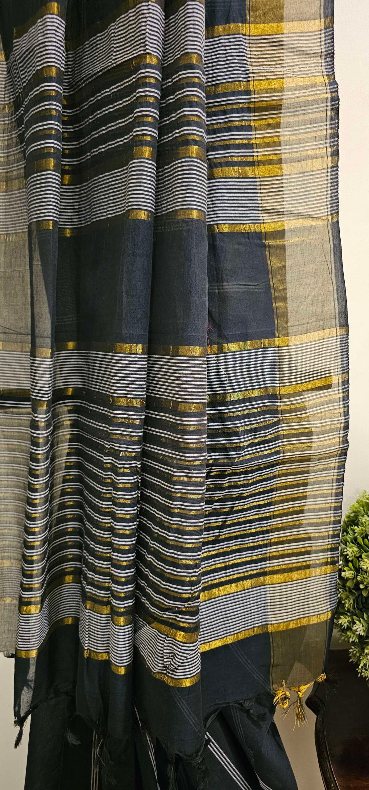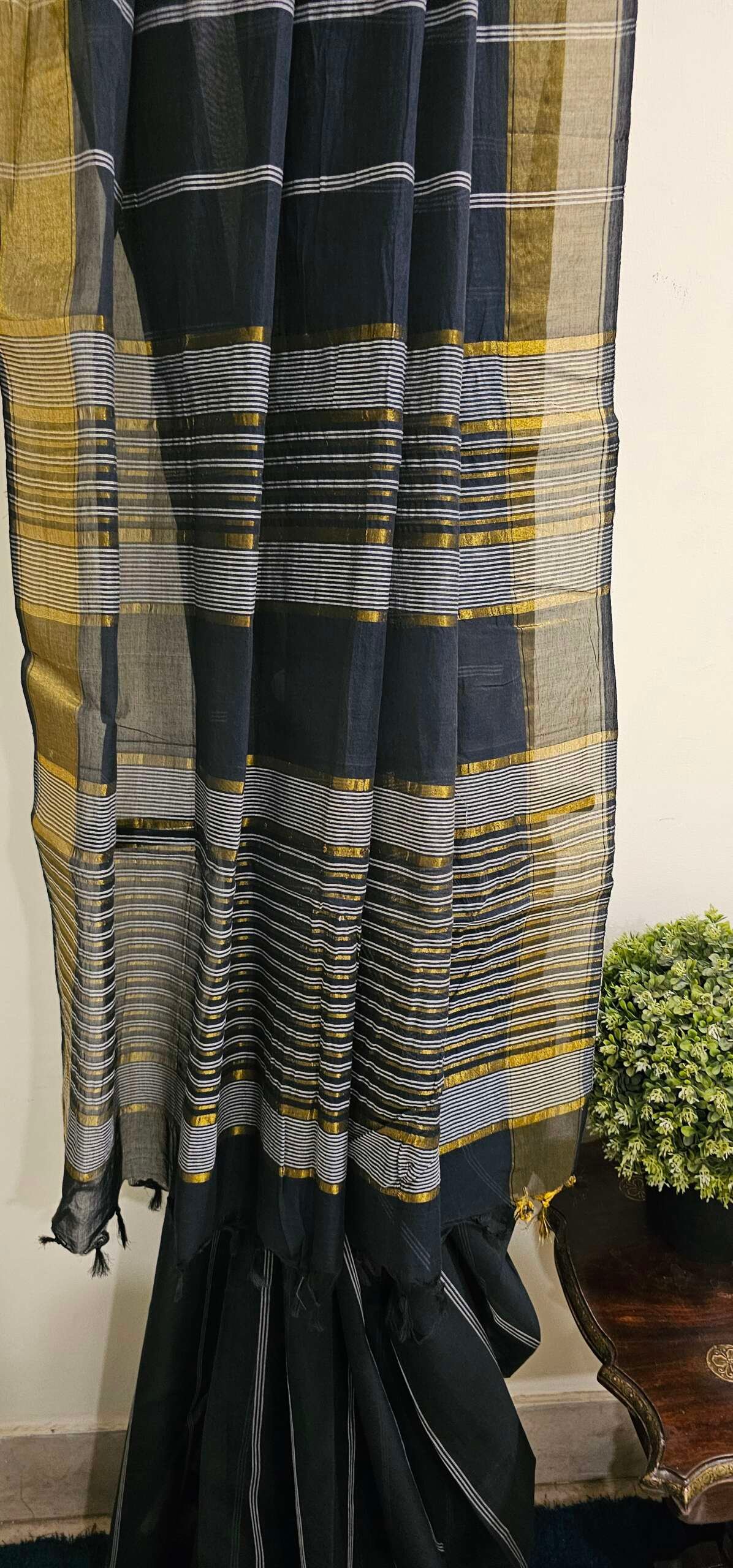 Black cotton saree, beautifully accented with golden zari borders and fine white stripe detailing. The pallu features a sophisticated play of horizontal lines and golden blocks, adding a rich and refined texture to the drape. This saree is crafted from soft, breathable cotton, making it ideal for long events, festive functions or even office wear with a cultural touch. The combination of deep black and shining gold exudes both power and grace.