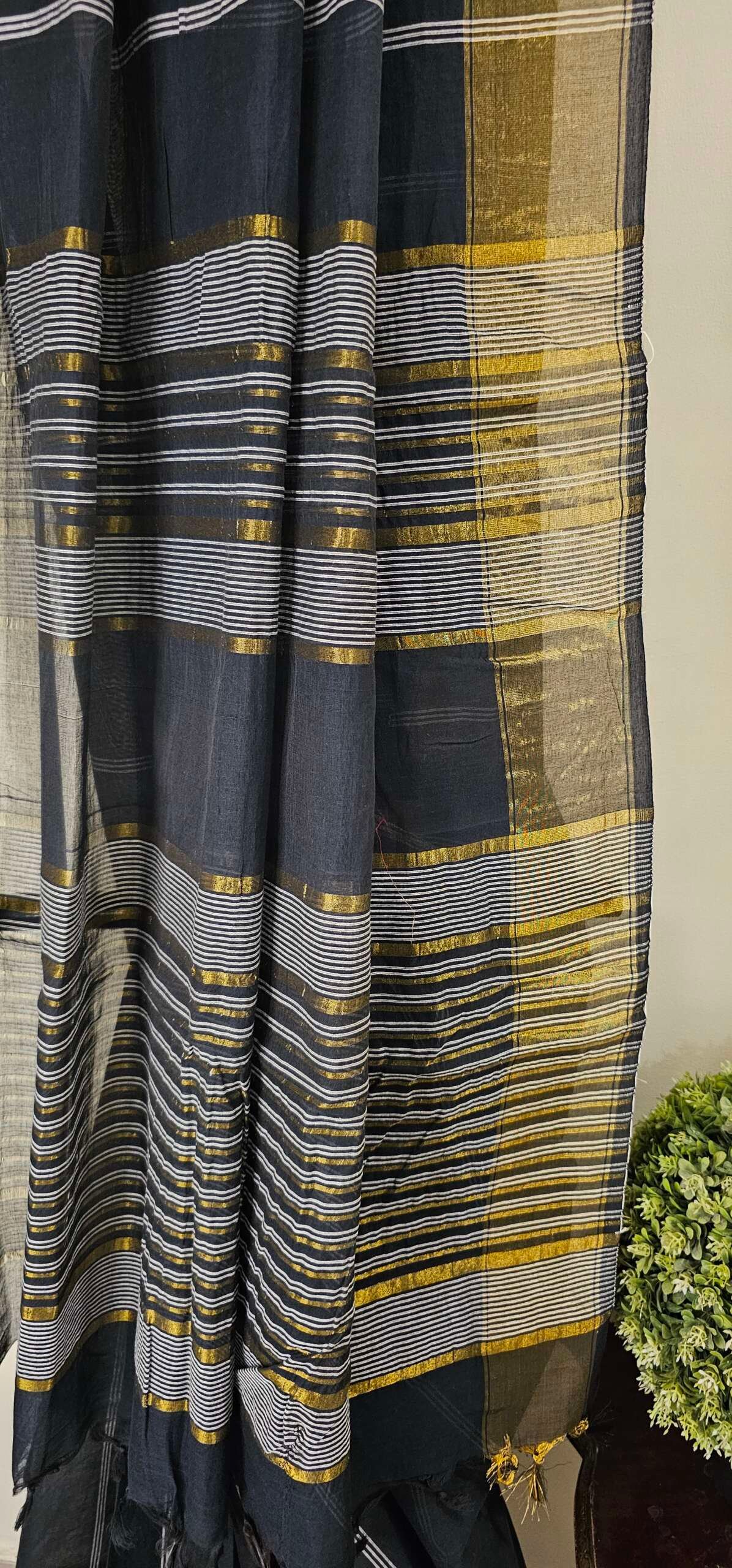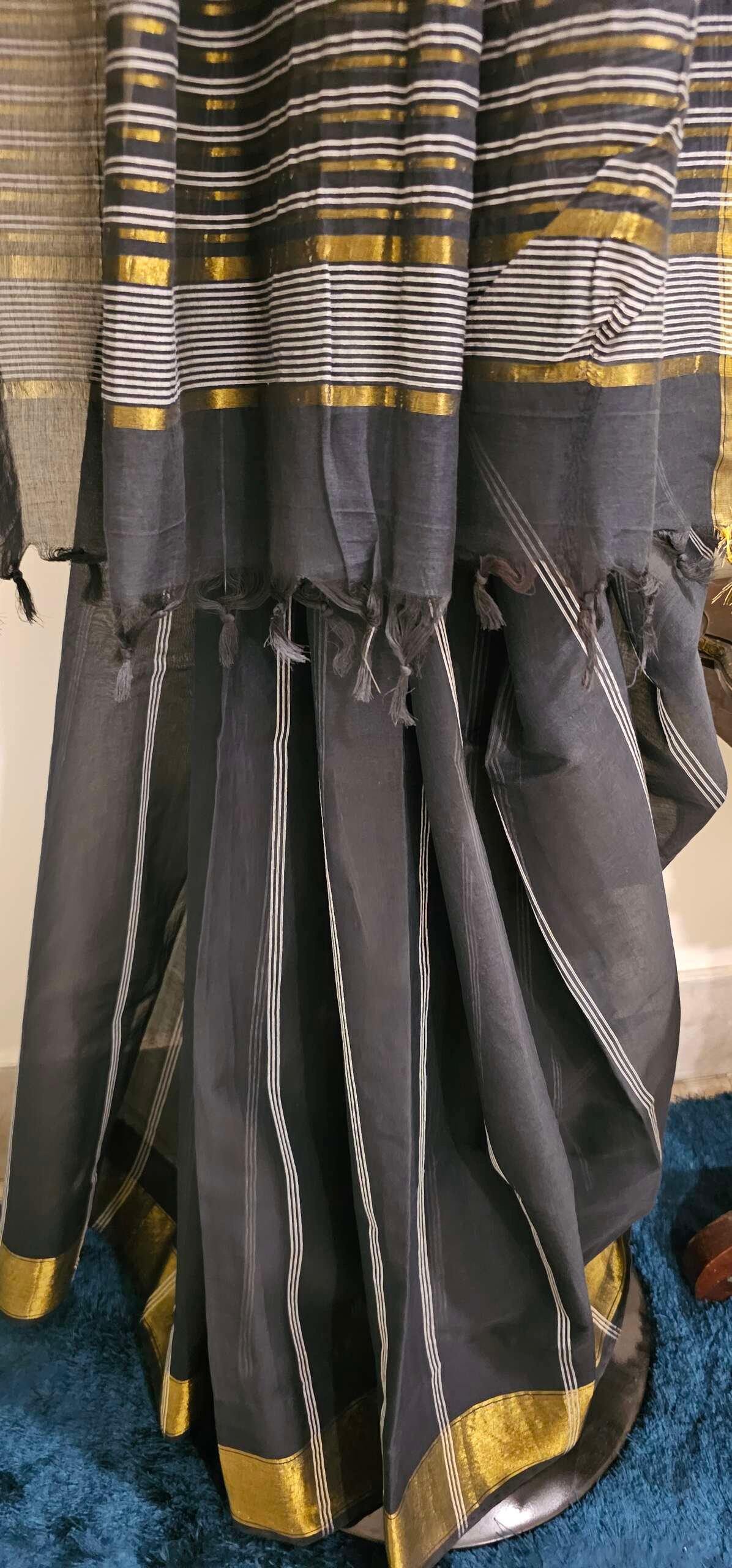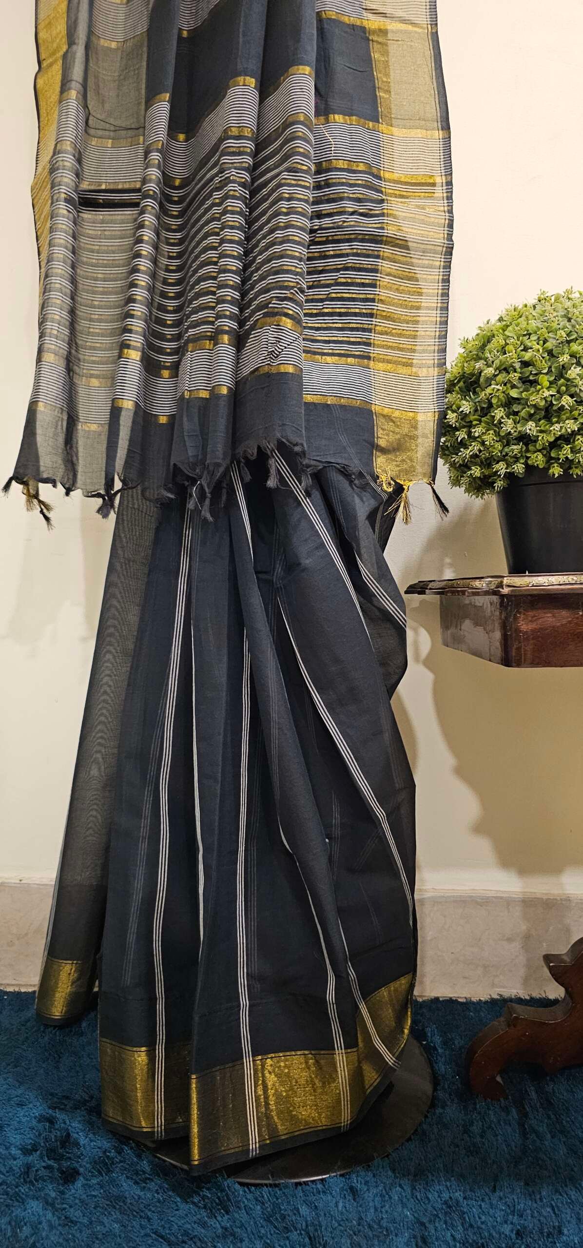 Black cotton saree, beautifully accented with golden zari borders and fine white stripe detailing. The pallu features a sophisticated play of horizontal lines and golden blocks, adding a rich and refined texture to the drape. This saree is crafted from soft, breathable cotton, making it ideal for long events, festive functions or even office wear with a cultural touch. The combination of deep black and shining gold exudes both power and grace.