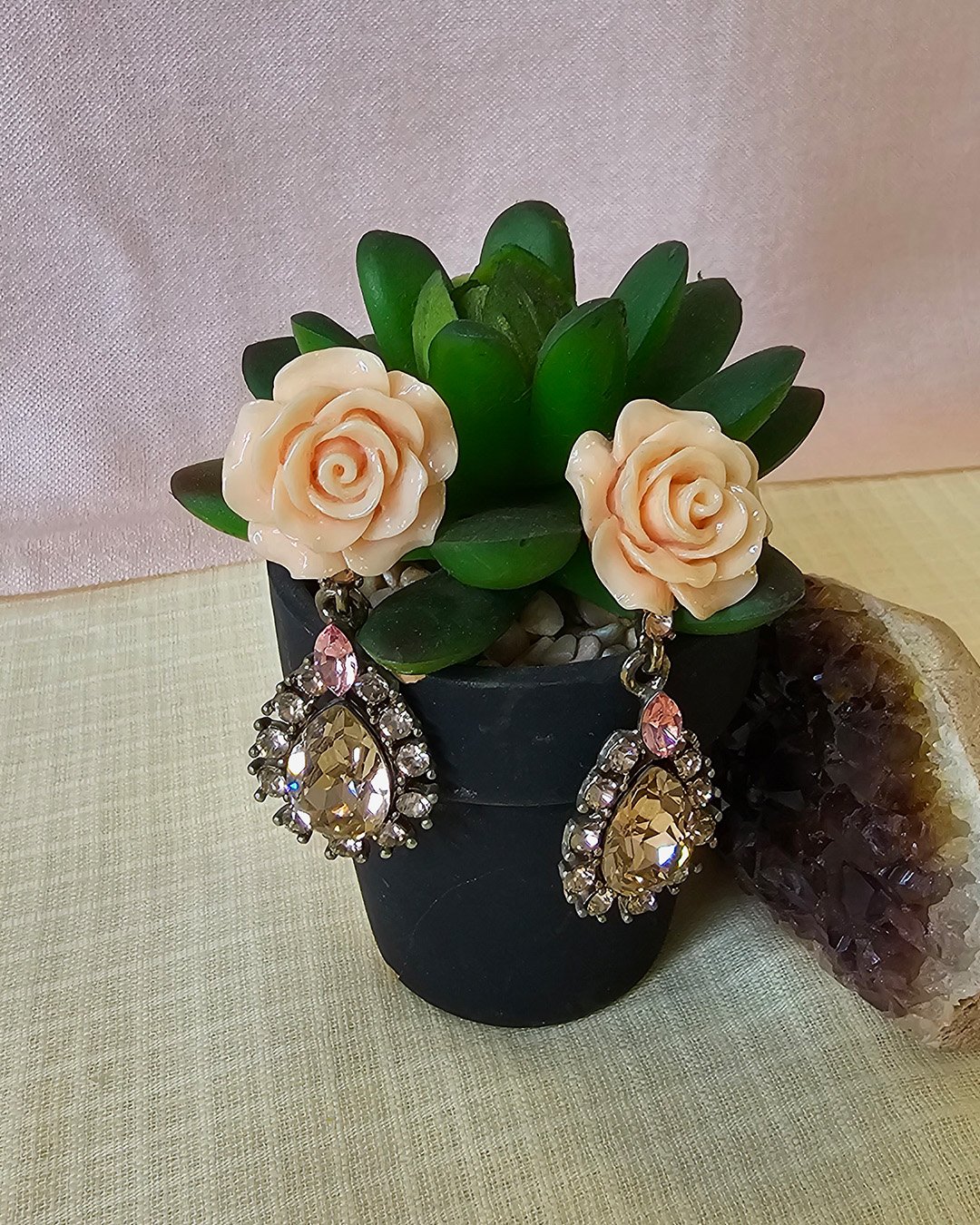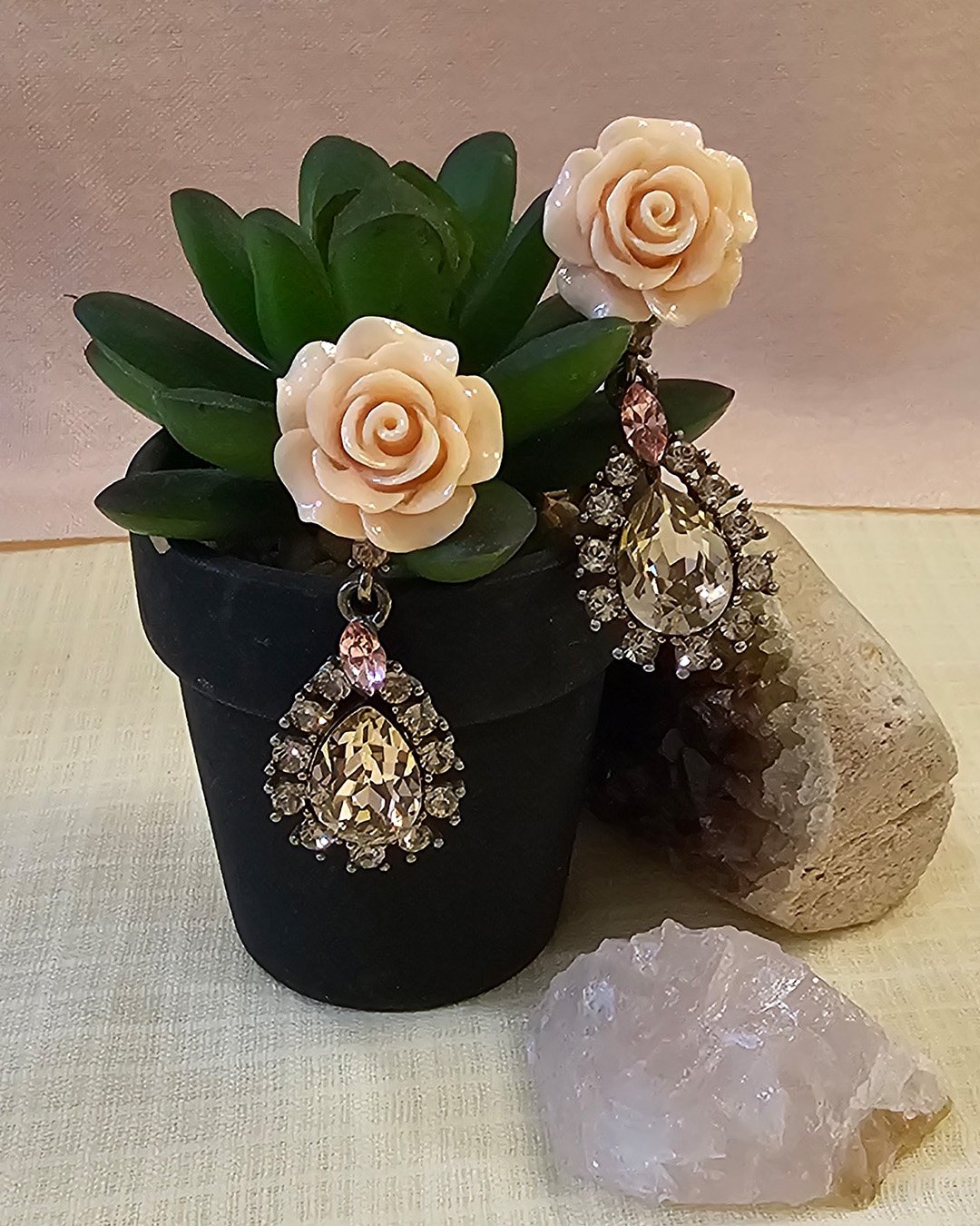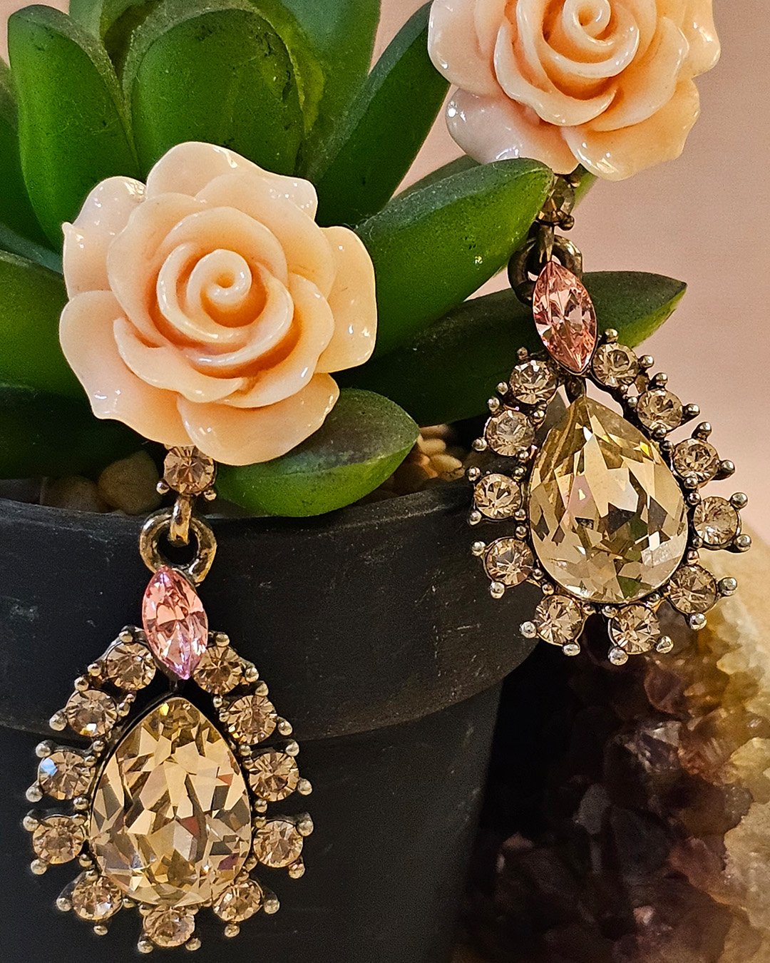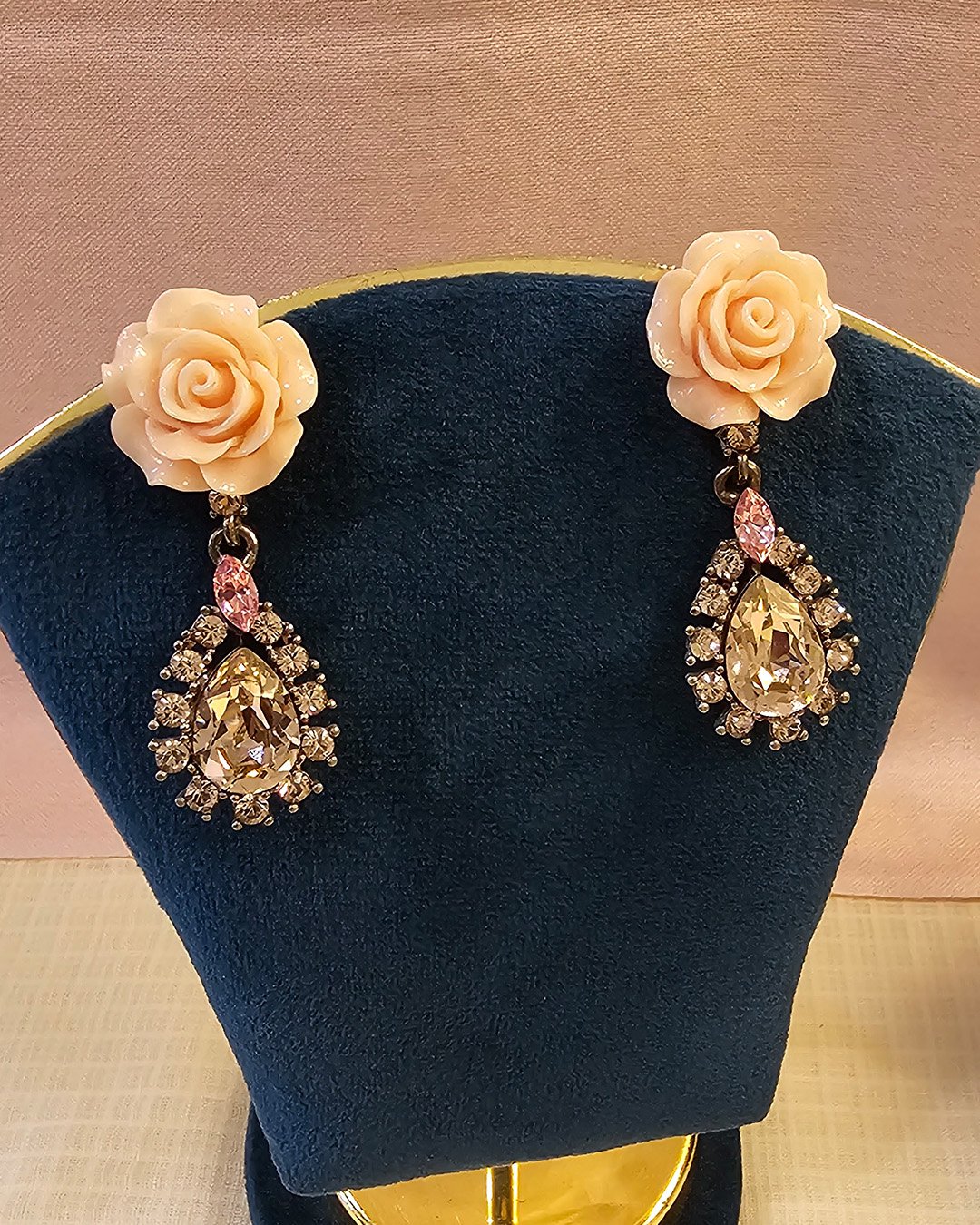Enchanting earrings beautifully blend elegance and whimsy, featuring a delicate green enamel flower with a tiny blue crystal center, perched above a golden heart-shaped frame adorned with lustrous pearls. The floral detail adds a fresh, playful touch, while the arrangement of pearls brings in a sense of vintage romance and sophistication.