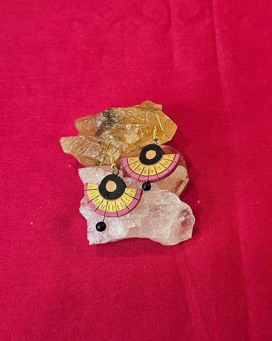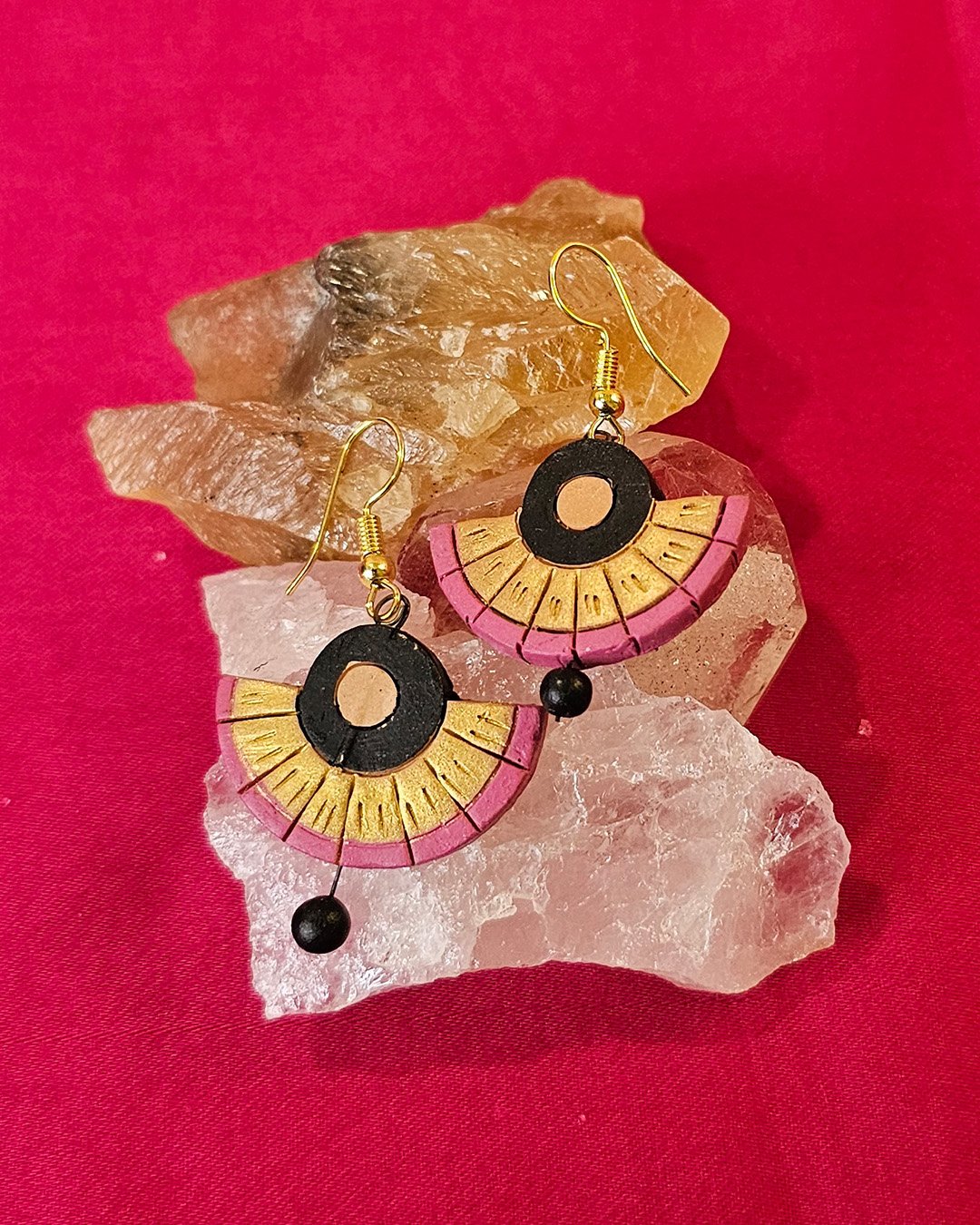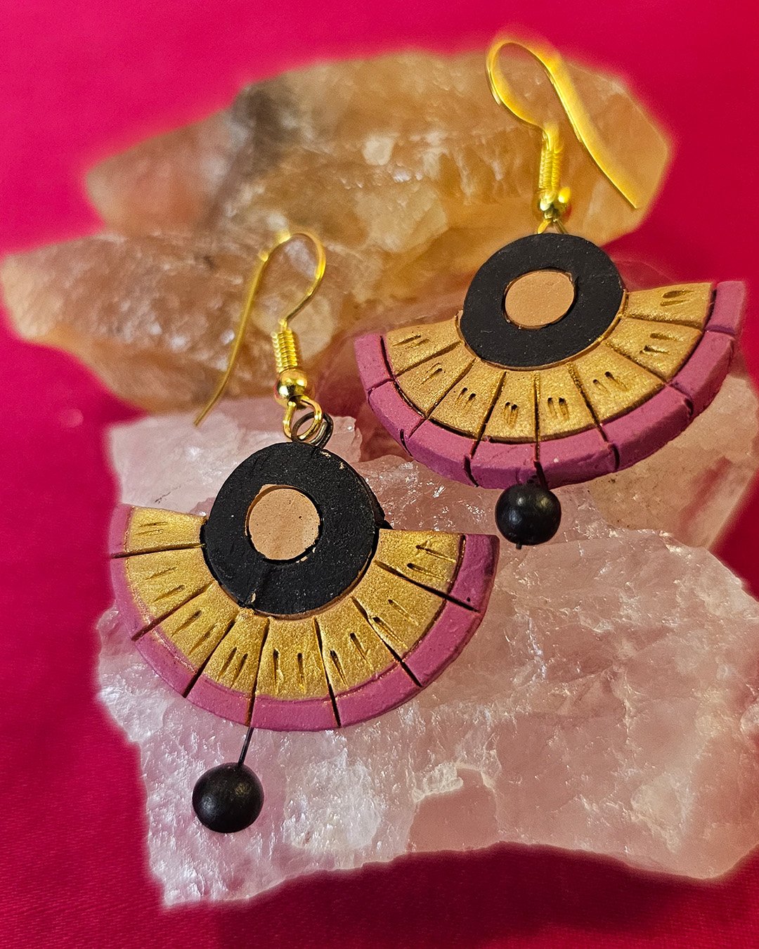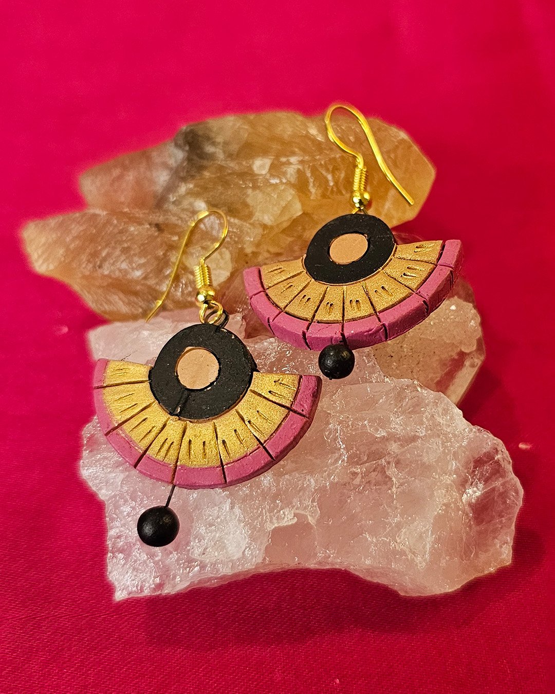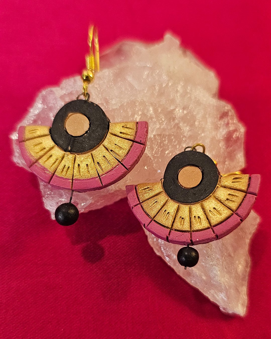 Handcrafted earrings feature a semi-circular design with black, gold, and muted pink hues. The top has a black hollow circle with a gold center, while the lower part has segmented gold and pink detailing. A small black bead dangles at the bottom, adding elegance and movement. Made from lightweight material, they have a bohemian and ethnic-inspired charm.
